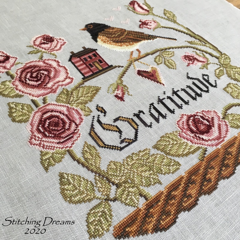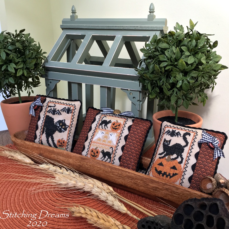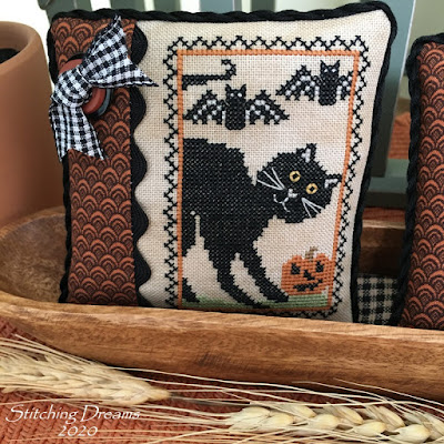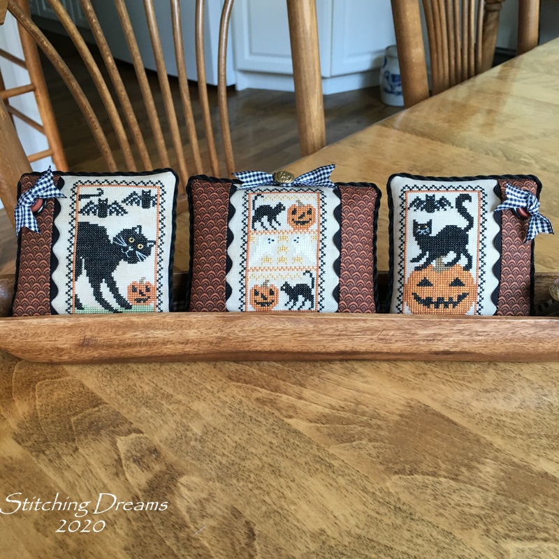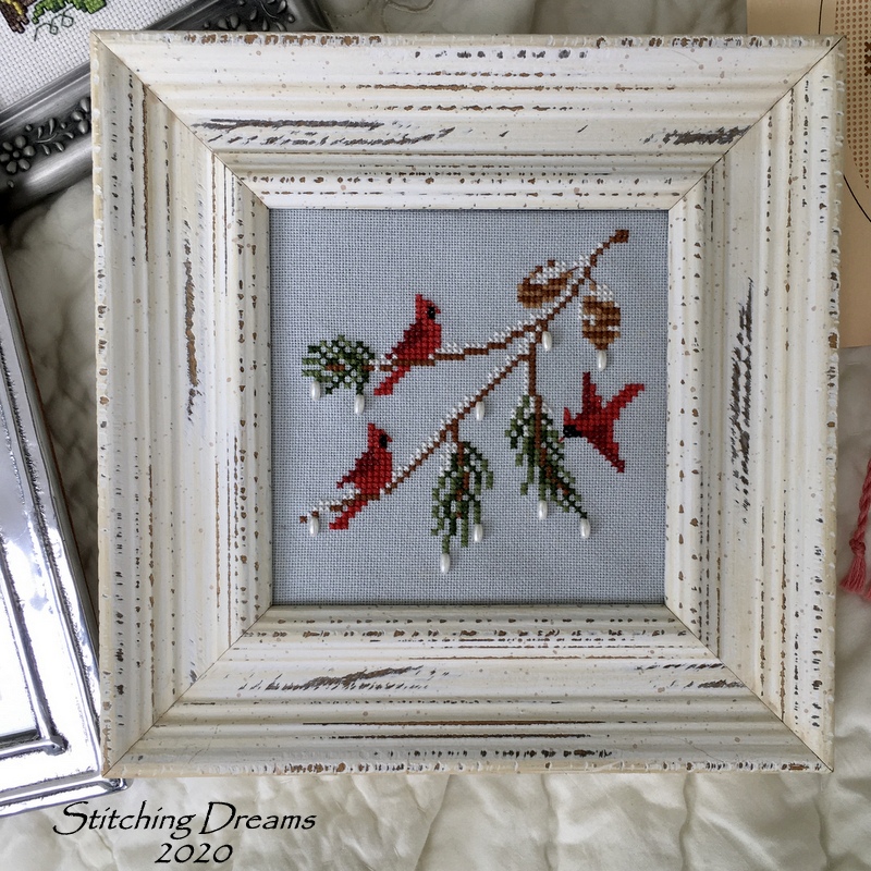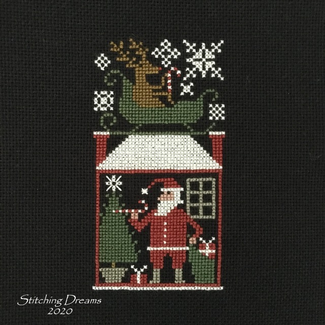 If this finish looks familiar it's because this is the fourth Santa in this series that I've finished the same way. Love seeing them all together! There are four more in this chart, but I only have enough gingham ribbon to finish one more. Of course, I can always change it up... we'll see!