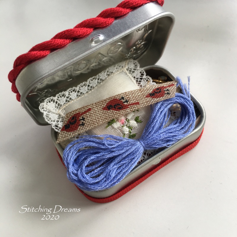To finish it, I created a simple pillow ornament bordered by green cording with just a touch of green ric-rac peeking out between the (40 ct. raw natural Newcastle) linen and the accent fabric.