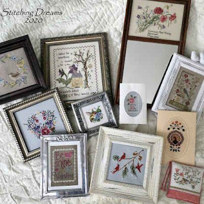 So, do you celebrate Valentine's Day? I think this is the first year in a long time that I didn't stitch a single thing for the holiday. But, I did do a bit of decorating in the corner of my kitchen. These are my "mostly red" ornaments, the "mostly pink" ones never saw the light of day this year, I'm sorry to say... They're still buried in a dresser drawer and, at this point, they'll just have to be patient and wait another year! I bought the sweet felted mice on Amazon and thought they made a perfect addition to my tiered tray display this year. If you have any questions about the stitched pieces, just let me know... I was too lazy to link them to previous posts this time :)