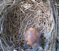 The newly hatched cardinal... Poor little thing--he looks so frail with his translucent skin and huge bug-like eyes. Hard to believe that someday he'll be one of the bright red birds we enjoy watching in our yard all year long.