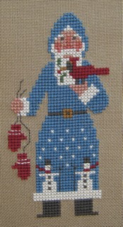 By now I'm sure you've gathered that Prairie Schooler designs are among my favorites! This is the second Santa I have stitched from the booklet: "Kris Kringle." This blue-robed Santa carrying his red and white mittens was stitched on 32-count sage jobelan with DMC threads. I love the tiny details on his outfit; the two snowmen holding brooms and wearing hats, with charcoal buttons, carrot noses, and red scarves wrapped warmly around their necks. So cute...If you look closely you'll notice that the Santa is carrying a small red cardinal with a holly branch in its mouth.