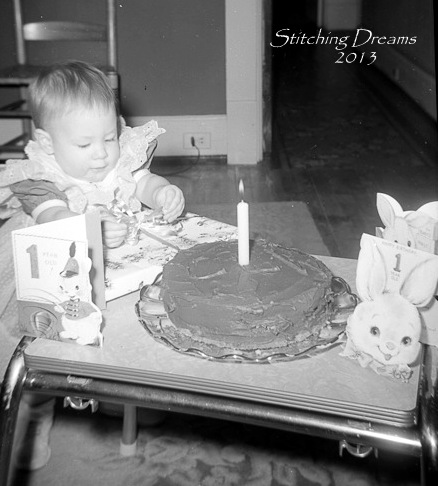Birthdays, that is! Yes, today marks yet another year in my march toward the big 6-0!! I'm 58 today, but the thought of that milestone birthday still two years away is very much in my thoughts these days for some reason. Here is one of my favorite photos taken on my very first birthday... I just love those pudgy baby fingers exploring the ribbons on my birthday present. What is it about chubby babies that is so appealing--just love them!! And how about those vintage birthday cards? I spot a smiling rabbit on each and every one--I guess I liked bunnies even way back then. This was taken in Buffalo, NY back in the mid-50s by my dear dad who was in medical school at the time. I wonder if I got a chance to sample that yummy looking chocolate cake my mom so lovingly baked for me? If so, I'll bet she carefully removed the sweet, lace pinafore that I wore in this photo...