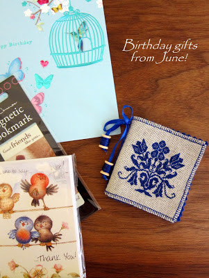 All the way from England and my friend, June, came this exquisite needlebook--my very first!! I had admired those miniature spools that she used to adorn one of her creations so I was thrilled to see that she added them to the ribbon on the needlebook. Don't you love the color of blue she chose? I think that is why blue is my favorite color; there are just so many shades of it--from the royal blue that June used to turquoise to the palest icy blue of a winter sky--I love them all! She also included a magnetic bookmark and some cute thank you cards. I love my gifts, June--you really are so kind to remember me and my special day!