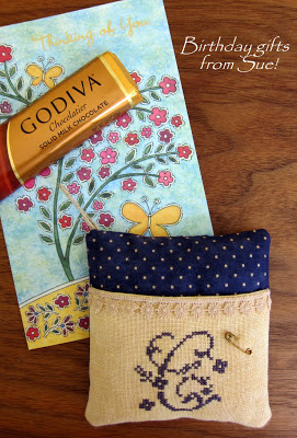 From the always sweet Sue came this beautifully handmade stitching pocket. In her card she noted that it is stitched on 32 ct. Golden Promise linen with WDW Williamsburg Blue. Isn't it lovely? She monogrammed it with the letter "C" from one of the Sajou alphabets and added the prettiest antique ivory trim at the very top of the pocket. I just love it, Sue--you were so thoughtful and kind to remember me on my big day. Oh, and that Godiva chocolate bar is certainly an extra-special treat, too!! Thank you so very much for your sweet gifts, my friend!