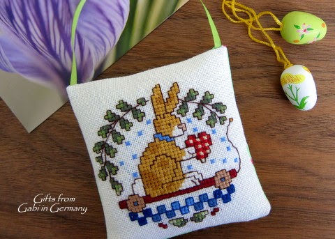 Your little ornament to your friend is so pretty. It's finished beautifully. Your backing fabrics are always perfect. I love that one from Lois. You have received some really loved gifts. The little bunnies in all shapes and sizes, edible and non edible are just gorgeous. What a lovely time of year to receive as many bunnies as possible. Your ornament from Gaby is so pretty. I have received some stitching from Gaby in the past and know how beautiful her stitching is.