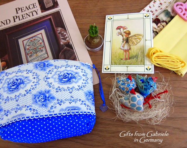 And from Gabriele in Germany came this wonderful assortment of goodies which included a trio of little hens sitting in a wispy nest, some pretty fabric and trims to aid in my finishing, a lovely chart, and a cute little candle shaped like a crocus bulb. But, the highlight of this gift package was the stunning cosmetic bag that Gabriele made.