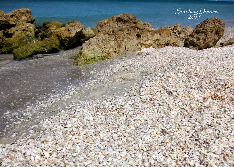 There weren't many good shells laying on the beach this year. Years ago, when we first began going to Naples (in the early 80s), we could find many. But, this year all we found were lots of little shells like this. This was an unusual amount all washed up together. I thought they were quite pretty with the rocks and the blue hues of the Gulf of Mexico behind them.