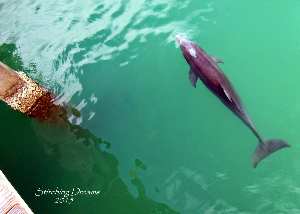And just look at what swam right underneath the pier as we were standing there--a dolphin! I was lucky to have my camera in hand and ready to go. I'm really pleased with this picture... I was actually even closer to a dolphin once before. Years ago, on a trip to Bermuda, my husband and I actually got to "swim with the dolphins"--what an amazing experience! To hold a dolphin's head between your hands and gaze into their eyes was very special.