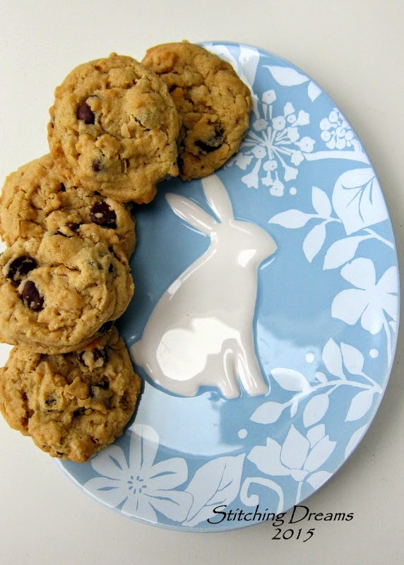 Well, I need to finish packing and get on the road for the five hour trip to New York. But, before I go, I want to share another cookie recipe with you. This one is my youngest son's favorite: Outrageous Chocolate Chip Cookies. Not only do they have chocolate, but also peanut butter--and who doesn't love that combination? I made these two weeks ago when he was home for a (way too short) visit and then again on Monday to take into work to share with my co-workers. Everyone loved them--hope you will, too! I managed to snap a photo before they were all devoured...