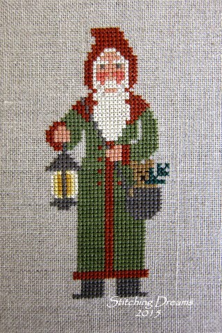 I'm so enjoying my Prairie Schooler Santa SAL each Sunday with Melissa and Hilda and have managed to finish my third Santa. This green-robed fellow is from Book No. 43: "Father Christmas." The only change I made to the suggested DMC colors was to the teddy bear in Santa's bag; I used DMC 610 for him. I was a bit worried about the shades of green and red when I first began stitching, but I really love the final look.