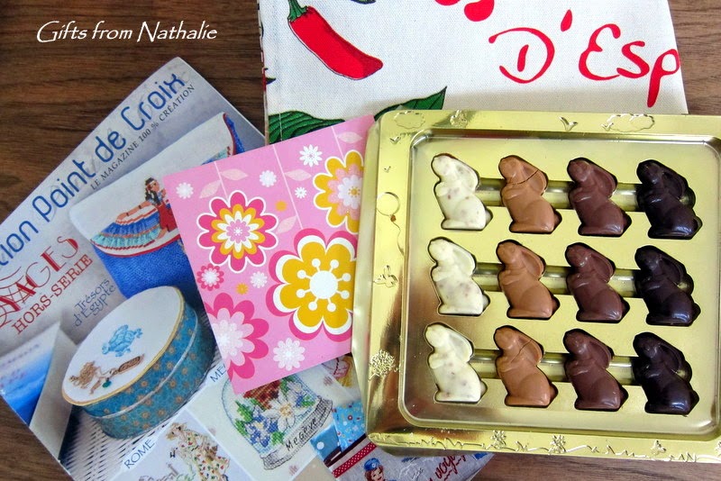 From Nathalie in France (no blog), came the most darling chocolate and caramel bunnies (most of which are now eaten), a French stitching magazine, and a pretty tea towel. The bunnies were almost too cute to eat--almost! I love your spring gifts, my friend--thank you again for thinking of me at Easter time!