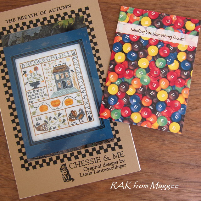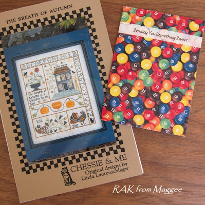 I also had a wonderful surprise earlier this month when I received this beautiful Chessie & Me chart from sweet Maggee. I had written in a previous posts about how much I loved Linda's designs and the specialty stitches that she uses so Maggee immediately thought of me when she was de-stashing and sent "The Breath of Autumn" my way. I just love it, Maggee--thank you so much for thinking of me. I can't wait to stitch it!