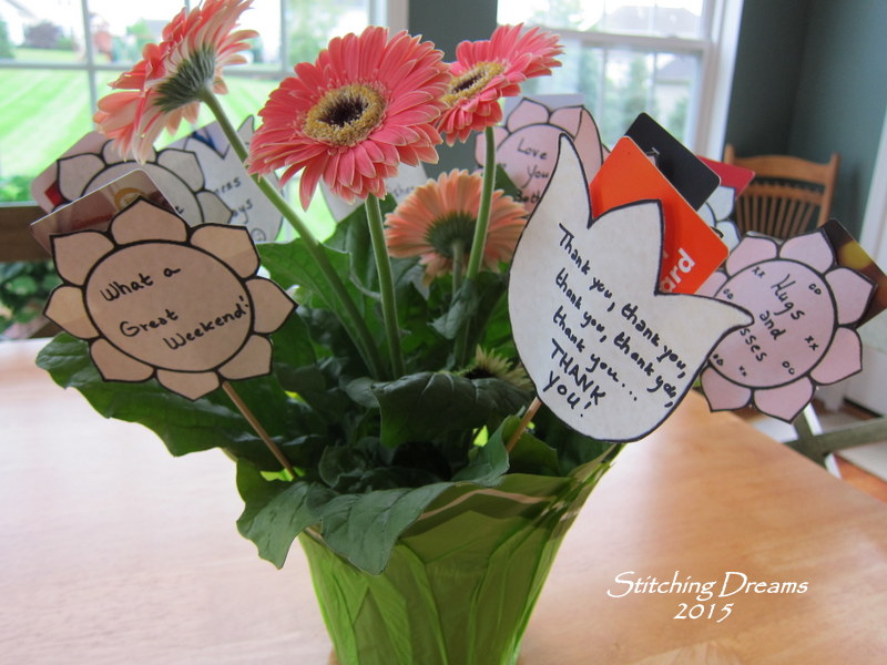 Since there were the five of us from my family (plus two girlfriends) attending the wedding, you can imagine what it would have cost us in hotel room fees! Luckily, my sister came to the rescue and gave us the use of her whole house (since she was staying at her lake house) for those days. It was so nice to be able to relax and spend time together while not having to go out for every meal. I wanted to find some way to thank her so I made her a gift card bouquet... Have you seen these on Pinterest? You simply cut out some flowers printed on cardstock, glue them onto skewers, and then glue another piece of cardstock on the back to hold the gift card. I chose to write little words of appreciation on the flower heads.