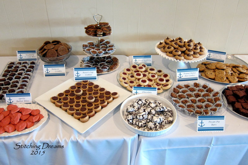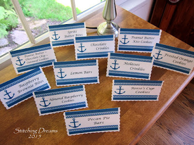 Since the wedding had a nautical theme, I made these cute blue and white cards with the cookie names on them. They added a nice touch and pulled the whole look together on the cookie table at the recption. My sister said they were a big hit although I didn't eat a single one--after weeks and weeks of baking (and tasting!), they just no longer appealed to me!