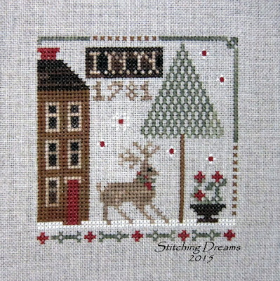 My June ornament is another LHN design called "Deer Valley Inn." I was a bit unsure about this piece as there was so much brown in it (not a fan of stitching with brown threads!), but I do love the way it turned out. I used a mixture of the suggested threads--both overdyed and DMC--and a few of my own choosing with 40 ct. raw natural Newcastle for this finish. The main change was the color of the door--I changed it from brown to red! I especially love the pretty tree in this one and the regal looking buck standing beside it.