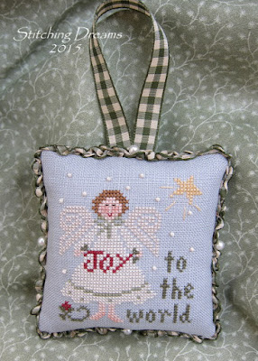 The ornament was made up with a combination of two fabrics, some ivory ric rac, and an old-fashioned gingham ribbon. This is actually one of my favorite ornament finishes ever! The colors in the stitching and the finishing fabrics just came together so nicely--don't you love it when that happens?