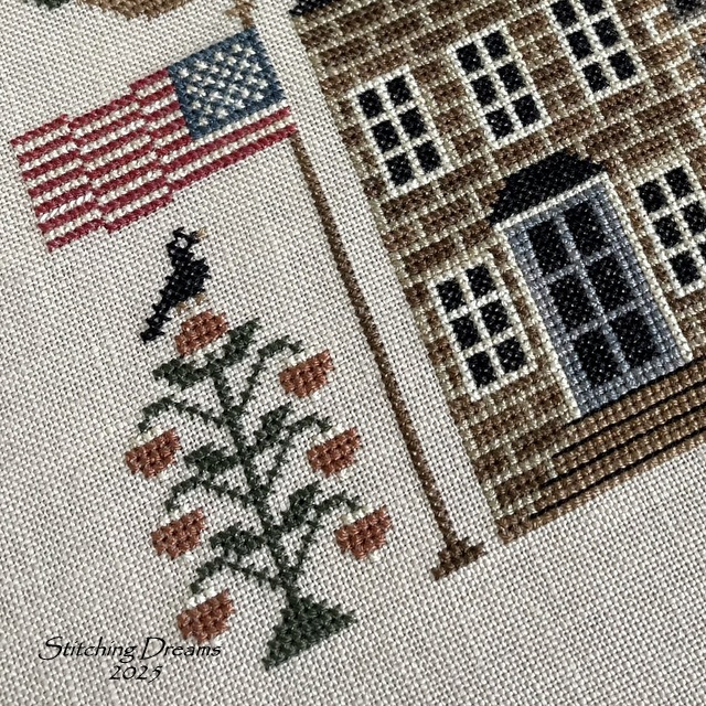 I did manage one finish and that is this beautiful summer design by The Scarlett House called "Hannah's Brownstone." Not a huge piece--in fact, on the 40 ct. burch Newcastle linen it ended up being just over 6 inches by 5 1/2 inches. But, I'll tell you--building that stone house sure took a while! I used the suggested overdyed threads along with DMC 935, but did change the blue in the flag to GAST Freedom. Unfortunately, the burch Newcastle seems to no longer be available here in the U.S. Why is it that all the fabrics that I love keep disappearing? So frustrating!