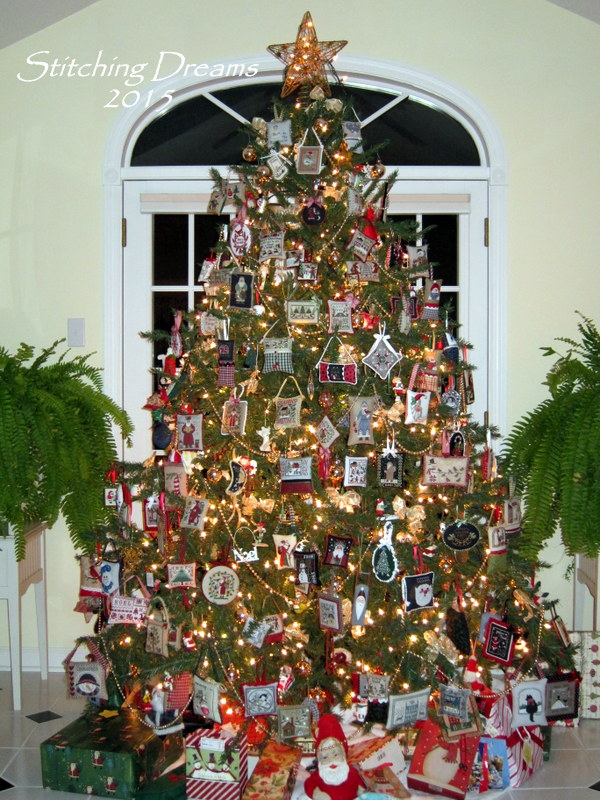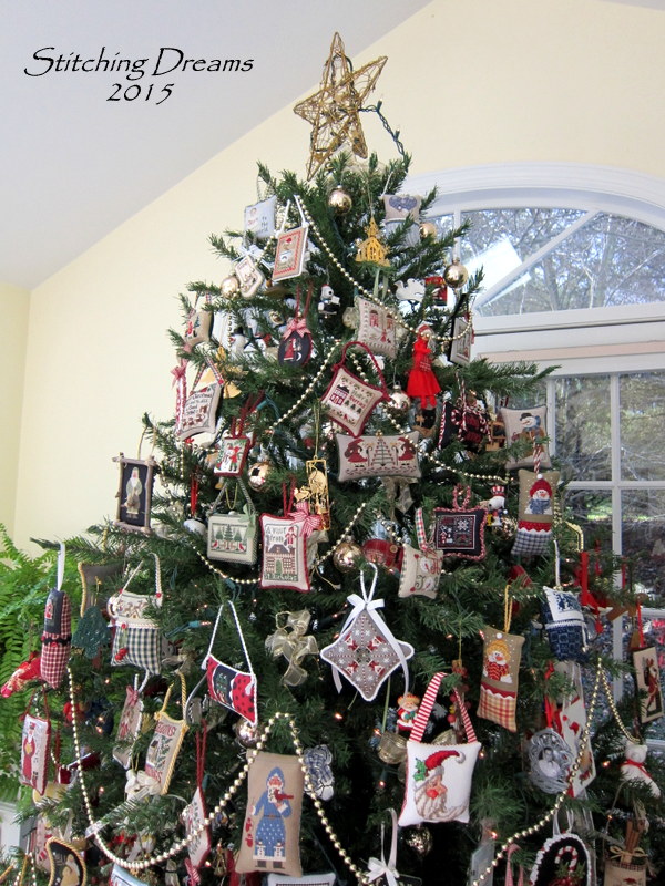 Now, many of you have asked to see a photo of my tree and I'm happy to oblige. We got a new star this year and, although, it doesn't photograph well, it is just so soft and pretty at night... Anyway, here is my 2016 tree with an accumulation of nine years of ornament stitching. People often tell me I've inspired them to stitch an ornament a month--that makes me so happy! It is such a joy to see them all on display in December and remember the stories behind them. I chose to stitch many of them because they remind me of people, places, or events that have been important in my life...
