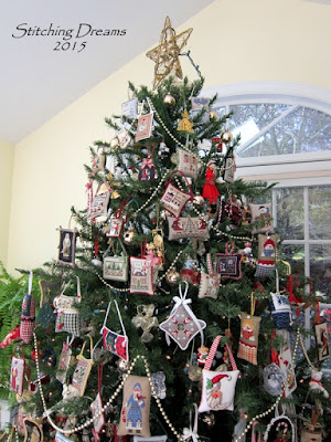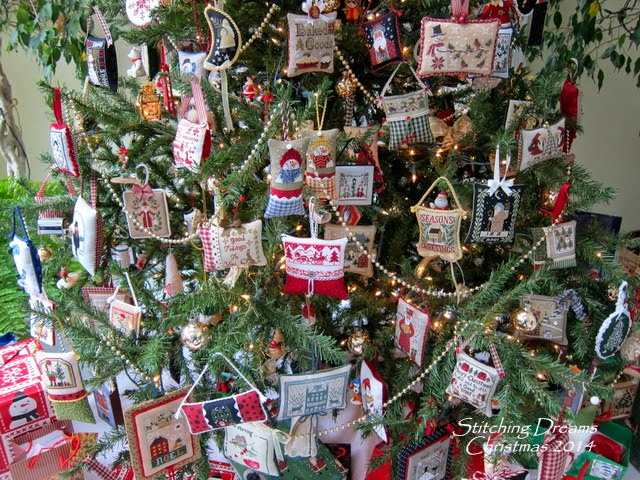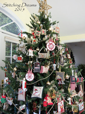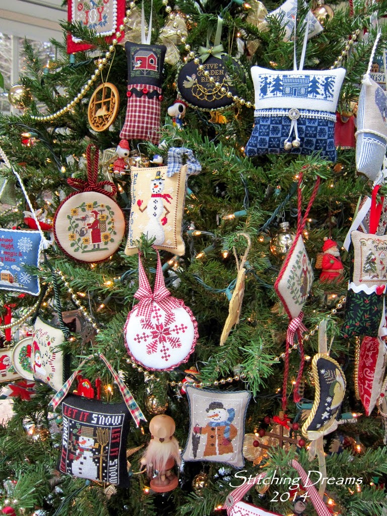 You might like to see a few close-ups--inch after inch of stitchy Christmas joy! Not much room left for future ornaments, is there? At this stage in our lives, we won't be getting a larger tree, though, so I'll just have to get creative. Eventually, when we truly downsize, I have visions of my sons and their future wives (hopefully!) sitting in a circle and taking turns selecting ornaments to take home to adorn their trees. My middle son already told me he wants all of the bird-themed ones--ha ha!!