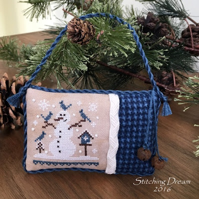 And I have another snowman ornament finish--my ninth of the year. Oh, wait, this is the 10th month of the year, isn't it? Yes, I'm behind--still need to stitch my snowman for October. I needed something quick and easy so I chose this little guy  by The Little Stitcher called "Blue Snowman." He can be found in the 2016 Just Cross Stitch Ornament issue. Once again, I used 40 ct. country mocha Newcastle--just love it!