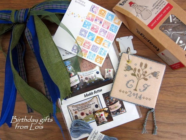 My dear friend, Lois in Northern Ireland, sent another fabulous package of goodies. She made a lovely floss tag (her first ever--and it looks perfect!) in the prettiest shades of blue and green. As you can see, it is monogrammed with my initials and the year and finished with a lovely blue/gray cording. The gift box also included a sweet chart called "Maddie Button" (I know I'll be stitching this one soon!), a lovely decorative bow, some silk floss, and a package of tea. Lois, your gifts put a huge smile on my face--thank you so very much!