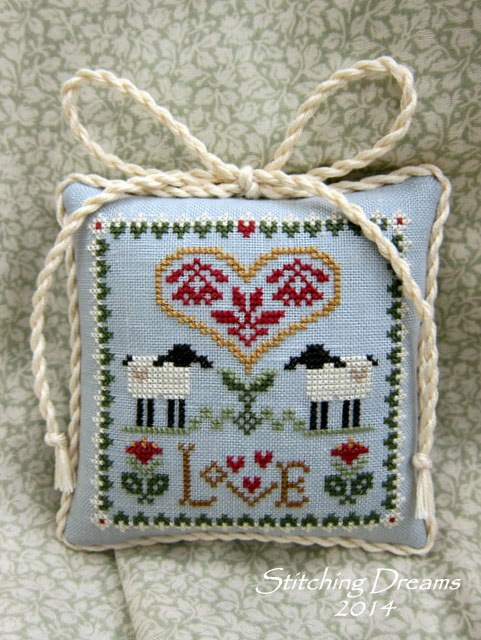 Another Little Sheep Virtues design, "Love,"  caught my eye and I thought it would be perfect for Valentine's Day stitching. This was sent as a Random Act of Kindness (RAK) to my friend, Lisa over at The Inspired Stitcher. I hope to do quite a few RAK's this year--just want to bring a smile to the faces of some of you wonderful stitching friends. Nothing is expected in return--I just enjoy surprising people now and then...  For "Love," I again used the 40 ct. pearl gray Newcastle (although it seems to appear blue in this photo for some reason) and the same threads that I chose for the "Peace" pillow. I added two more small red hearts above the heart near over the "V" rather than add the suggested button. Both Cindy's gift and Lisa's RAK were backed with the pale green and ivory fabric you see in this photo. I think I'll be stitching this a second time to add to my bowl of Valentine's pillows...