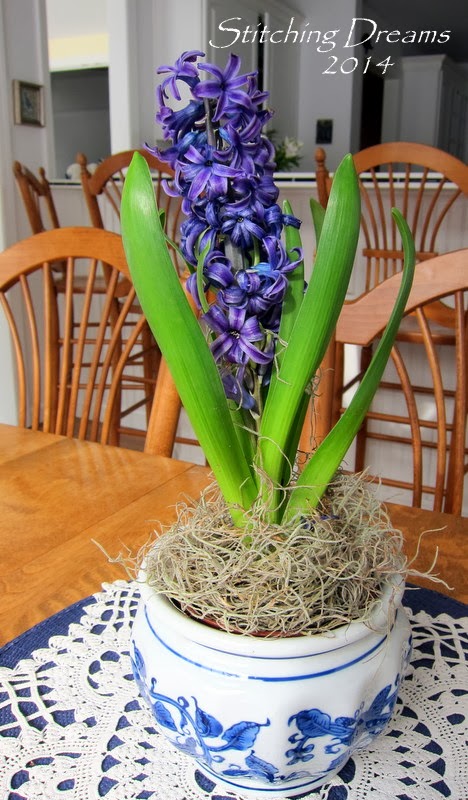 Two wonderful gift certificates from 123 Stitch arrived from my oldest and middle sons and my middle son and his girlfriend also gave me this pretty blue and white bowl filled with the most fragrant hyacinth. It's been such a pleasure to enjoy a bit of spring as the snow flies outside!
