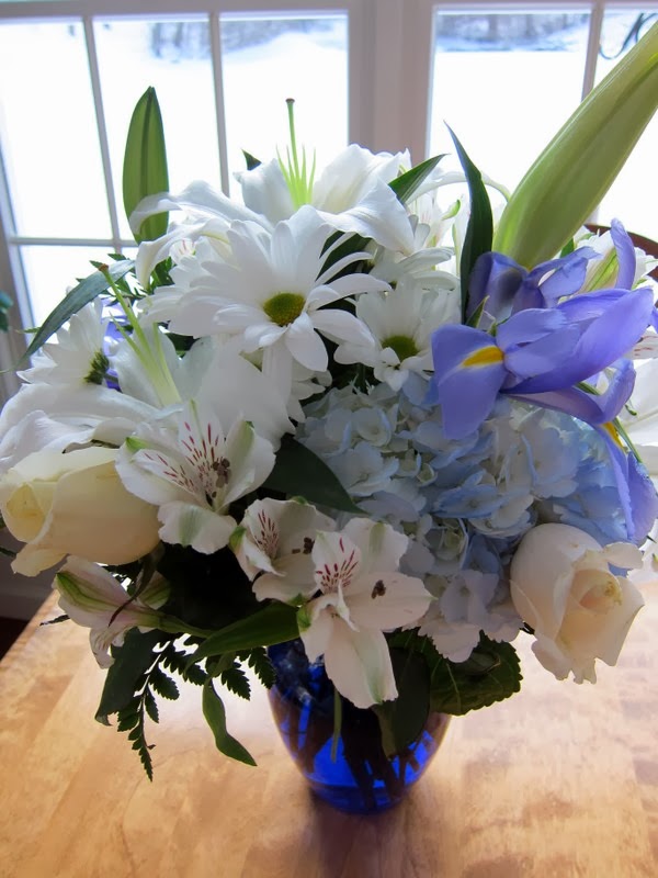 BIRTHDAY ROUND-UP... Several of you asked what my sons cooked for my birthday dinner. I'll tell  you... it was such a treat to just sit and be waited on that evening! I'm not used to others cooking for me and I honestly didn't quite know how to just sit and relax as they bustled around the kitchen cooking and doing the dishes... The main dish they prepared was called Pasta all'Amatrice and was prepared with a new-to-me pasta called bucatini. It was like a thick hollow spaghetti--have any of you had it before? Very, very tasty and quick to prepare. They also served roasted vegetables (not a green one in sight, thank goodness!!), garlic bread, and ended the feast with a selection of little cheesecakes for dessert. It was an almost-perfect evening--if only my youngest son could have been there with us, too. But, he surprised me by sending this simply gorgeous flower arrangement. Hydrangeas, lilies, iris, daisies, and white roses--such a perfect bouquet for me!