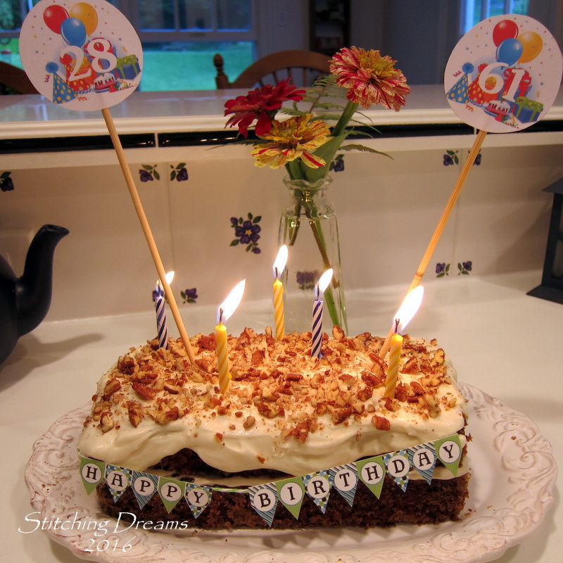 Birthday boys... My husband and youngest son have July birthdays within 5 days of each other so when my son decided to pay us a surprise visit on his birthday, I quickly whipped up this small carrot cake. I made a tiny banner from one I printed off the internet, added a couple of signs denoting their ages, and a few candles. It was so, so tasty!