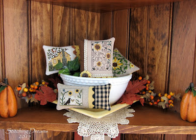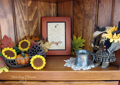 Good morning, my blogging buddies, on one gorgeous autumn morning here in western Pennsylvania. I think this September may have been one of the nicest (and warmest!) on record and I've loved every second. The sunny days and the crisp, cooler nights are just my "cup of tea"... I've been stitching a couple of fall things and putting out a few autumn-hued decorations and my house just seems much cozier these days--like it's welcoming me to spend the colder days ahead all curled up in my stitching chair. Sounds like a nice plan, doesn't it?
