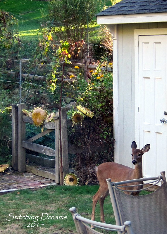 I'll leave you with a photo of this sweet little fawn who made his way up to munch on some sunflower seeds. Each year, after the sunflowers have finished blooming, my husband lays the giant flower heads out on the fence that surrounds his garden next to the tool shed. The birds, chipmunks, and deer all delight in this unexpected feast!