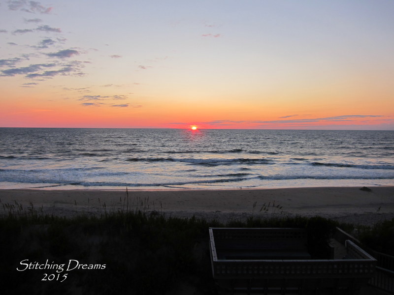 I was delighted to see the 2014 Prairie Schooler Santa this year--he's a caroler! (Yes, I'm a bit partial to carols and caroling for some reason--I wonder why?). The newest PS Santa was my beach stitching this year. Although I tried to stitch in the car on the 10-hour drive down to Corolla, NC, I didn't have much luck. I'm not sure if the road was too bumpy or it was just too hard to deal with the 40 ct. fabric without better lighting. So, this Santa got stitched over a number of days while I was away on vacation--usually just an hour or two each morning. What a great way to start my day!