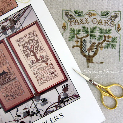 I've also begun a larger Prairie Schooler Sampler from Book No. 40 "Band Samplers." I've wanted to stitch this one for so long, but have avoided it because of the abundance of browns in the design--I simply don't like stitching with browns! But, I finally just took the plunge and I can't tell you how much I'm enjoying stitching this piece--even that crazed-looking giant squirrel making his way up to the tree top! I'm using 40 ct. flax Newcastle with DMC threads and, hopefully, I'll have it finished up for you next time I post.