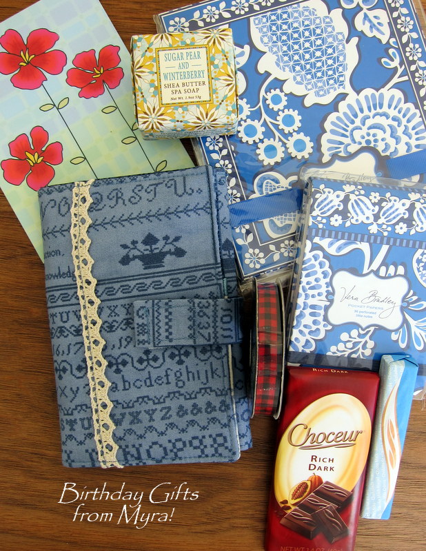 I'm not sure if any of you heard my cries of joy when I opened Myra's gifts on January 16th, but I'm sure I could be heard well into the next county!! Just look at what she made for me--one of her beautiful stitching wallets... Isn't it gorgeous?! Tucked inside was a package of needles and there are three compartments to hold threads, scissors, and even a small chart or two. I absolutely love it, Myra--and you couldn't have picked prettier blue fabrics for me. But, that's not all she sent; I also received a delightful bar of fragrant soap, two Vera Bradley notepads, some finishing ribbon, and an assortment of chocolates (which are long gone!). Thank you so much, my generous friend--you certainly spoiled me this year!