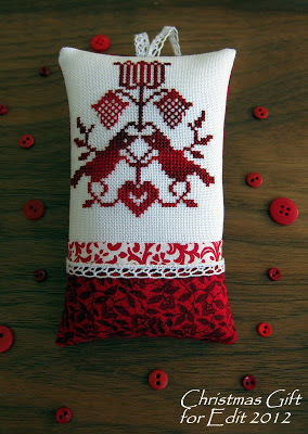 To my young friend, Edit, who lives in Spain, went this pretty design from an older Just Cross Stitch magazine (November/December 1997). It is called "Folk Doves" and is designed by Ginger & Spice. I used DMC 115 on 32 ct. white Jobelan and dressed it up with some contrasting fabrics and bit of lace trim. I thought this ornament was fitting for Edit because her year was filled with lots of love--she has a brand new baby! I also stitched a little ornament for her new daughter, but forgot to photograph it before I sent it on its way, so if you'd like to see it, you can go to Edit's post right here.