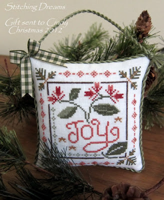 This Little House Needleworks ornament simply called "Joy" was sent to my friend Cindy. The funny thing is, I received the exact same ornament (which I dearly love!) from my friend June for Christmas! I used 40 ct. antique white Newcastle and the suggested DMC threads for it... Also added some Mill Hill beads (#02052) and handmade cording in DMC 3052 to finish it off. I hope this little gift brings you much J-O-Y in the new year, Cindy!