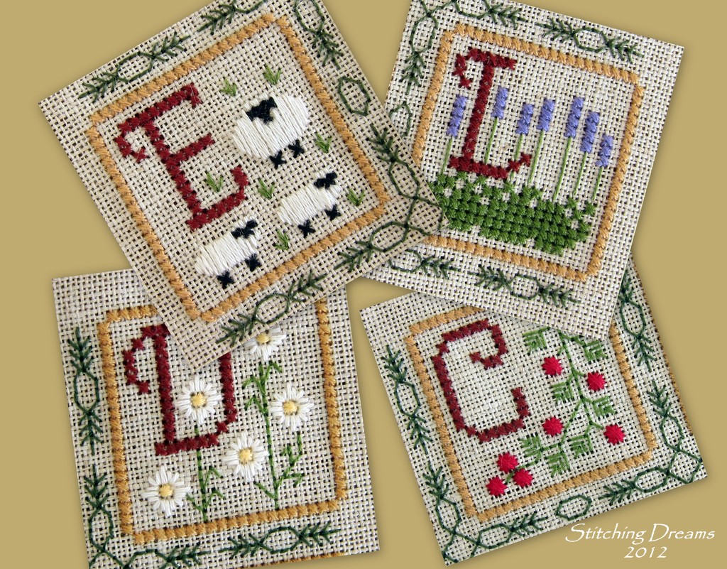 What have I been working on so far this year? Well, a bit of a larger than normal piece (for me at least). I've had the lovely Nature's Alphabet by Elizabeth's Needlework Designs in my stash for years and finally it just begged me to stitch it. I'm loving this one, even though all that hunter green backstitching between each blog is a bit tiring. I'm up to the "P" block now, but don't want to spoil the surprise so I'll just share just a few of my favorite blocks so far: "E" is for Ewes, "L" for lavender, "D" for daisies, and "C" for cherries... (These are all stitched on one large piece of linen--I just photographed the blocks separately and created this little collage). Aren't they pretty? And the specialty stitches add such beautiful texture!