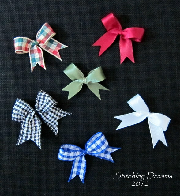 One of the most common questions I'm asked is how I make those tiny bows that you see on so many of my ornaments... Well, if it weren't for the helpful tutorial of that amazing finisher, Barbara from "To Stitch or Not To Stitch", I wouldn't know how to make them either. She did a wonderful step-by-step tutorial back in 2010 which you can find right here. My bows differ only in that they are much smaller. I start out with only about a seven inch piece of ribbon (usually 9 mm or 3/8 inch, but sometimes I use wider ribbon as you can see in the black and white gingham). And rather than tying another piece of ribbon around the center, I just wrap the thread (that I've used to gather up the center) around and around and tie it in the back to create a nice look. Trim the ends as long or short as you like and voilà--you have a sweet, (almost) perfect bow! Give it a try--it only took about half an hour to make the six in my photo.