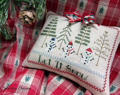 I just couldn't resist stitching this adorable, bald snowman shivering in the January winds. I'm sure you all recognize this as a Lizzie Kate piece. It's called "A Bit of January" and is stitched on 32 ct. sage Jobelan--always a favorite fabric of mine whenever I'm stitching winter scenes because the snow stands out so well. It was stitched with whatever overdyeds I had in my collection. I then made it into a little pillow using fabric from an old flannel shirt (one long abandoned by one of my sons--probably from the '90s!). I added a bit of white ric rak peaking out from the flannel and kept the finish quite simple. Here is the final result: