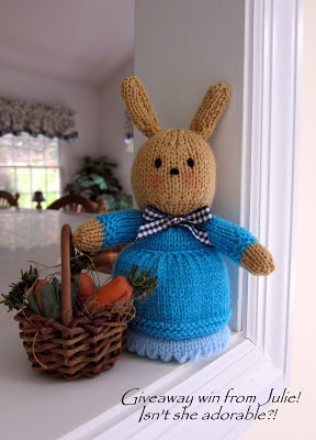 And, after many, many years of being the lone female in my house (even our cat was male), I'm pleased to announce I finally have a sweet little girl--a knitted girl bunny courtesy of Julie from Julie's Stitchyknitter Journal. I won Julie's 5th blogoversary giveaway and she made me this adorable little cutie! When she arrived, Miss Bunny was a bit hungry so I found this basket of carrots for her. And she's still adjusting to my odd American accent, but I think she's beginning to feel right at home. Julie's knitting is amazing and she wrote on her blog that over 50 of her precious bunnies are now living all over the world. I've seen them on other stitchers' blogs and I'm so proud to have my very own "Julie made" creation. But, what to name her?? Any ideas? Having only named boys, I'm at a bit of a loss... I do have one idea, but I'd love to hear your suggestions! Thank you so very, very much, Julie--I know she will make a most delightful stitching companion...