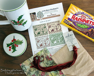 Cindy, one of my very first blogging friends and fellow January birthday girl, sent me this sweet LHN chart called "This Is My Joy." With it she included not only the fabric, but a skein of Belle Soie silk in the loveliest shade of burgundy. I've never stitched with silk before and am so looking forward to it. Along with the stitching things, Cindy sent me a very cute Christmas mug to hold my hot chocolate while I'm munching on those chocolate covered raisins which she included. Your gifts truly made me smile, Cindy, and I want to thank you so very much!