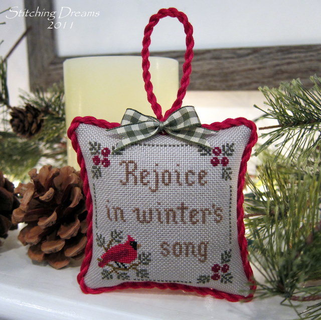 And to one of my very first blogging friends, the cardinal loving Myra in North Carolina, went this sweet ornament by Plum Pudding Needleart called "Winter's Song." I hope you're not getting tired of cardinals, Myra--you're certainly getting quite a collection!! I stitched this one "over one" on 28 ct. Bay Leaf Jobelan--a fabric I know I'll be using again. I loved the simple message on it...