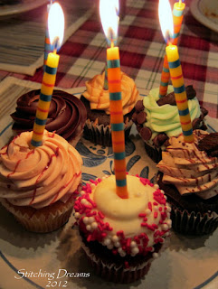 So, I'll bet you're all wondering about the birthday dinner that my two older sons cooked for me? Well, I'm happy to report there wasn't a green vegetable in sight--not one!! They served me chicken parmesan on angel hair pasta, garlic bread, fruit salad, and for dessert these wonderful cupcakes. It was so hard to pick just one flavor--there was mint chocolate chip, peanut butter, strawberry, double chocolate, yellow with chocolate frosting, and red velvet. Which would you have chosen? I finally selected the double chocolate, but had a taste of my husband's peanut butter one as well--absolutely scrumptious!! The guys gave me a variety of stitching and crafting gift cards and a new GPS (I'm known for having absolutely no sense of direction so this will be a huge help!) which I'm still smiling about. I love you so very much my guys; thanks for making my birthday one to remember...