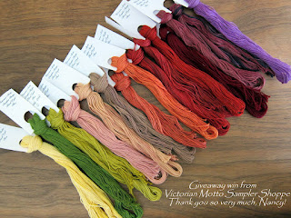 I was also the lucky winner of a very special giveaway... Just look at what Nancy at Victorian Motto Sampler Shoppe sent me: fifteen of the most gorgeous threads I've ever seen. What a luscious rainbow of colors! If you haven't visited Nancy's blog, please pay her a visit soon. In addition to her wonderful threads, she offers some lovely charts, charms, and a whole plethora of ric rak and trims. Thank you so much for your generosity, Nancy--I can't wait to find the perfect project to showcase your lovely threads...