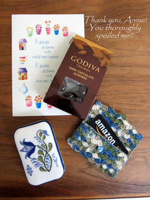 But, wait--that's not all! In addition to some yummy chocolates, Annie also crocheted a charming gift-card holder in the most soothing shades of blue and green. And snuggled inside was a very generous Amazon gift card to buy myself a book or two for my Kindle. I think it took me an entire day to stop shaking my head in disbelief at Annie's generosity. You really spoiled my, my friend, and I will treasure your gifts! Thank you, thank you, thank you...I'm so glad our paths crossed through this amazing cross stitch blogging community.