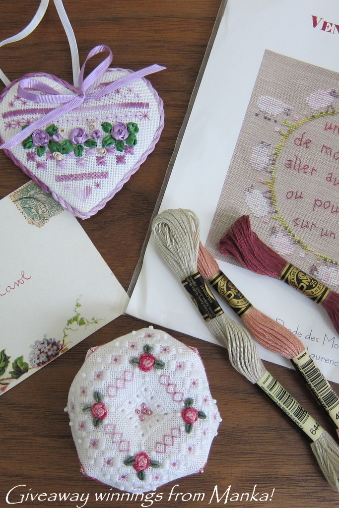 THANKS TO... It's always good to get away, but, for me, there is nothing like returning home! I love my house and yard and being surrounded by my stitching and books and other simple things that make me the happiest. When I got home I found a lovely surprise waiting for me from Manka. Just look at all of these beautiful goodies that arrived in a recent giveaway win all the way from Hungary. I wish I could show you just how perfectly stitched the heart shaped bookmark and the biscornu are. The ribbon roses are lovely and the delicate specialty stitches add so much to these pieces. The talented Manka offers some lovely free designs on her her blog, so if you haven't visited, please stop by. Thank you again, my sweet friend from Hungary--I love each and every thing you sent my way!