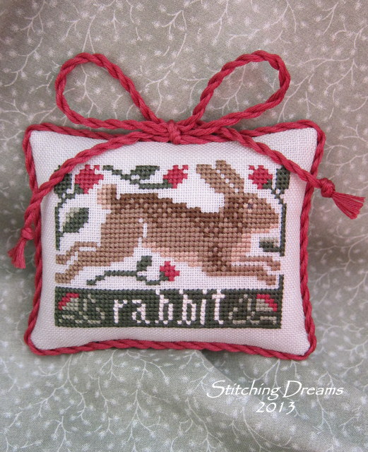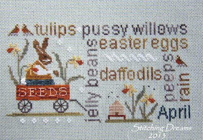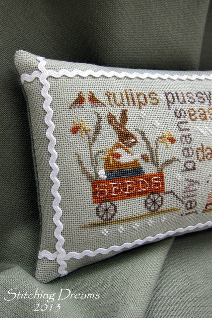 I also had to change the way the word "Seeds" was stitched on the little wagon since this was stitched over one.  Stitching it the way the design was charted made it too crowded looking so I simplified the letters a bit. And, taking the advice from several of you who already stitched this, I gave the bunny a cute and fluffy white tail made entirely of French knots (or my version of them--I am NOT the best French knot maker in the world)!