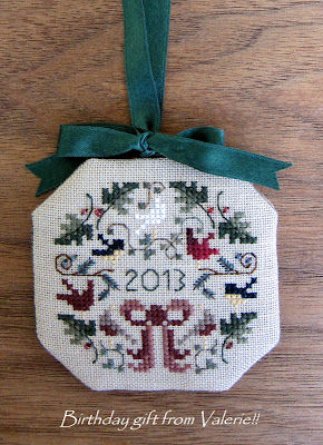 And from one of my long-time blogging buddies, Valerie (Fog City Dweller blog), came a belated birthday present package (which, believe me, was well worth the 3 month wait!!). I honestly gasped, "Oh, it's beautiful," when I removed this beauty from the package. Just look at this stunning Drawn Thread ornament that Valerie made for me--perfectly stitched and finished! And you know what, I had picked this exact chart to stitch for my April Christmas ornament--luckily I hadn't begun yet! This is from "The Holly and the Ivy Sampler" chart and is one of my favorites. How did you know Valerie?