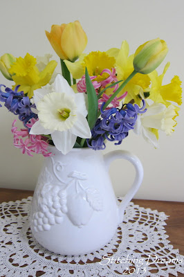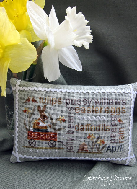 So, will I stitch more of these Word Play designs? Probably--I did buy all twelve charts after all!! (And don't we all always stitch each and every chart we purchase--ha ha!) But, I will have to stitch them sparingly--just now and then, not one month after another. I'll be skipping May and June, but might pick up July during the summer. Here is a photo that will give you a better idea of the size of the little pillow next to some freshly picked daffodils from our back yard...