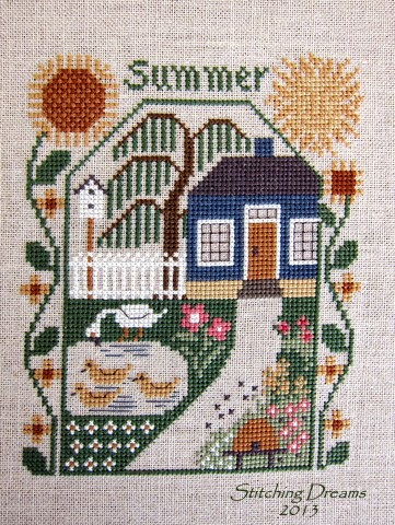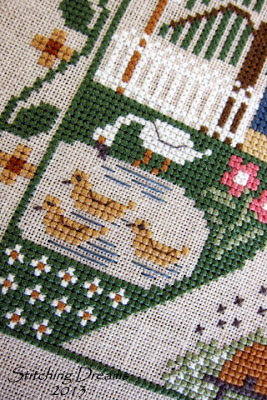 "Summer" is stitched on 32 ct. flax Belfast linen using the suggested DMC colors (except for the little ducks which I changed to a lighter gold than was charted). I changed the ducks' beaks, too (using straight stitches rather than cross stitches), and gave them French Knots (well, my odd version!) for eyes. There is a mistake on this chart--the sunflowers on the left were charted for a different color than the ones on the right although in the photo they were all the same, so I stitched them all in the lighter gold.